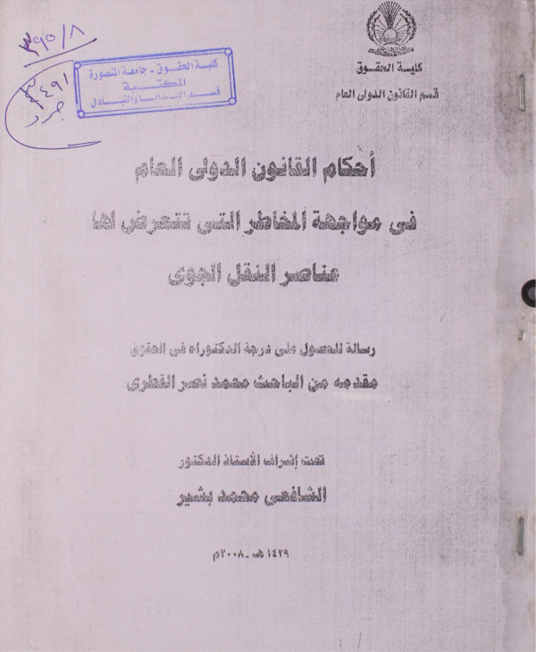 أحكام القانون الدولي العام في مواجهة المخاطر التي تتعرض لها عناصر النقل الجوي / إعداد محمد نصر القطري ؛ إشراف الشافعي محمد بشير.