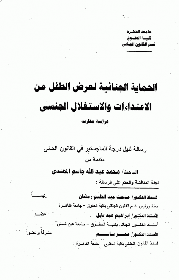 الحماية الجنائية لعرض الطفل من الاعتداءات والاستغلال الجنسى : دراسة مقارنة / إعداد محمد عبدالله جاسم المهندى ؛ إشراف عمر سالم