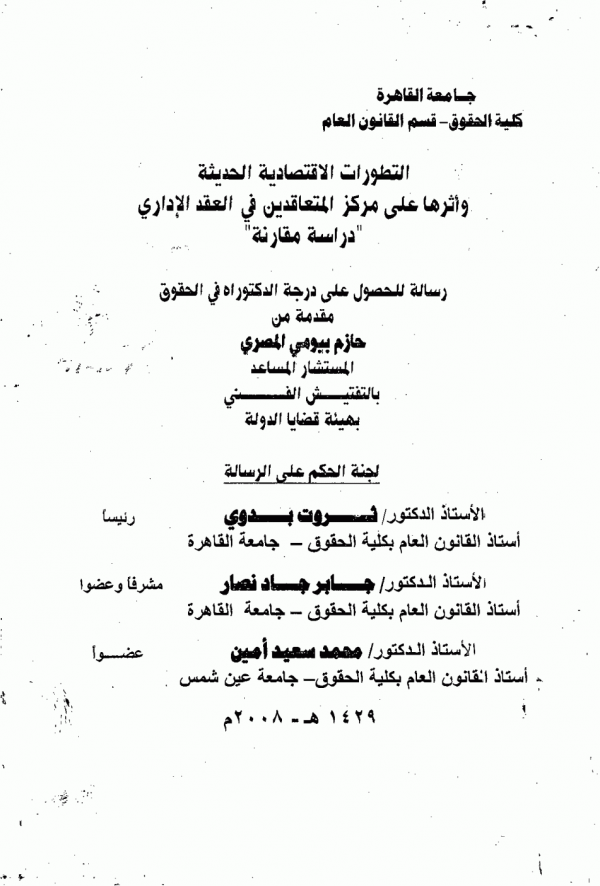التطورات الاقتصادية الحديثة وأثرها على مركز المتعاقدين في العقد الإداري : دراسة مقارنة / إعداد حازم بيومي المصري ؛ إشراف جابر جاد نصار.