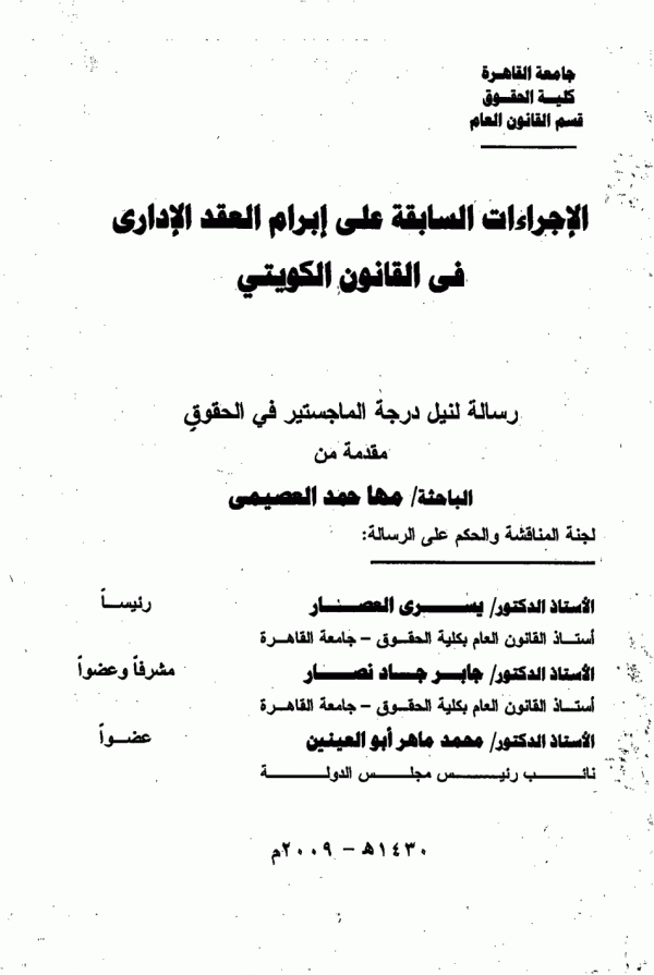 الإجراءات السابقة على إبرام العقد الإدارى فى القانون الكويتي / إعداد مها حمد العصيمى ؛ إشراف الأستاذ الدكتور جابر جاد نصار.