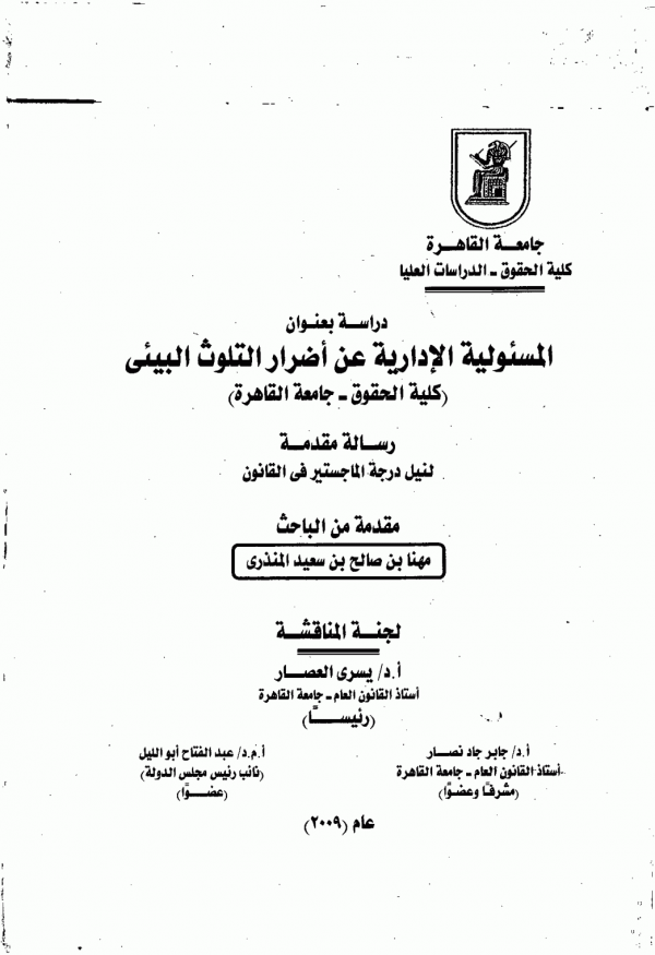 المسئولية الإدارية عن أضرار التلوث البيئى / مهنا بن صالح بن سعيد المنذرى