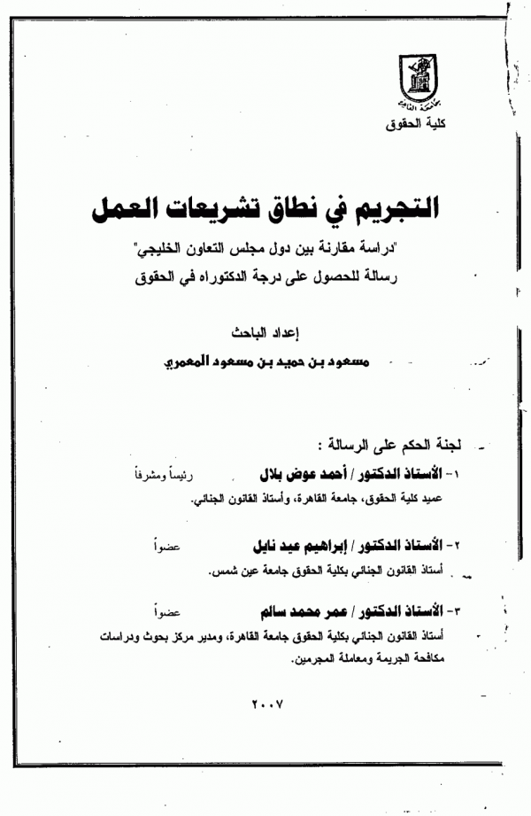 التجريم فى نطاق تشريعات العمل : دراسة مقارنة بين دول مجلس التعاون الخليجى / اعداد: مسعود بن حميد بن مسعود المعمرى ؛ اشراف احمد عوض بلال