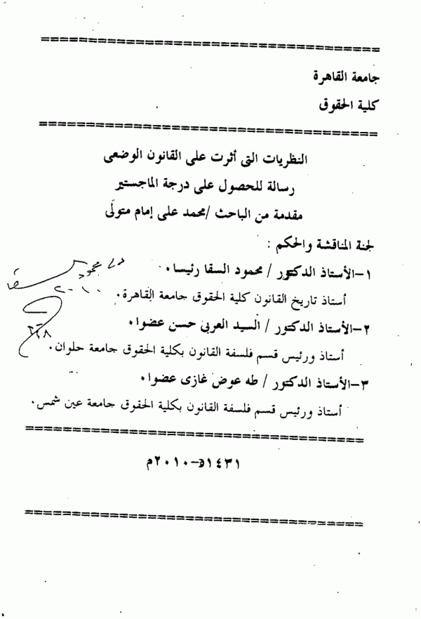 أطروحة (ماجستير) - جامعة القاهرة - كلية الحقوق - قسم فلسفة القانون وتاريخه 2010.