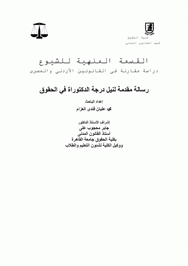 القسمة المنهية للشيوع : دراسة مقارنة فى القانونين الأردنى و المصرى / إعداد محمد عليان فندى العزام ؛ إشراف الأستاذ الدكتور جابر محجوب علي.