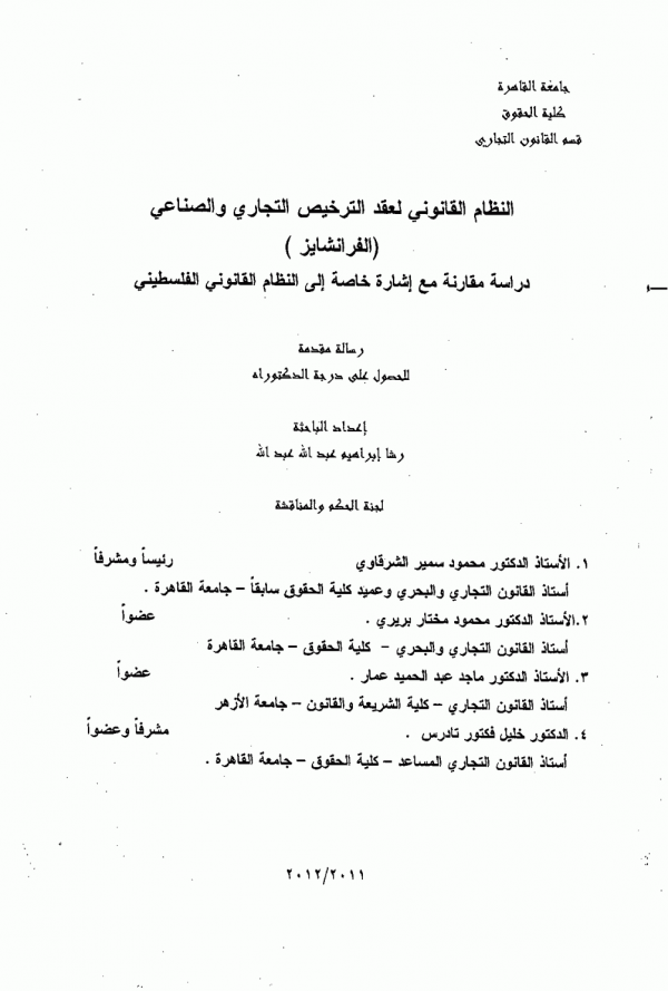 (النظام القانوني لعقد الترخيص التجاري والصناعي (الفرانشايز : دراسة مقارنة مع إشارة خاصة إلى النظام القانوني الفلسطيني / إعداد رشا إبراهيم عبدالله عبدالله ؛ إشراف محمود سمير الشرقاوي : خليل فكتور تادرس