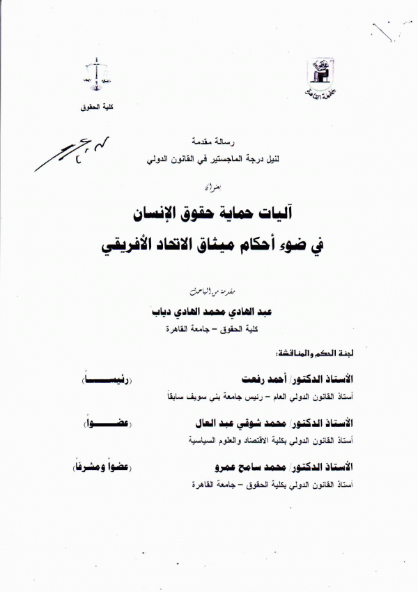 آليات حماية حقوق الإنسان في ضوء أحكام ميثاق الاتحاد الأفريقي / عبدالهادي محمد الهادي دياب ؛ إشراف محمد سامح عمرو