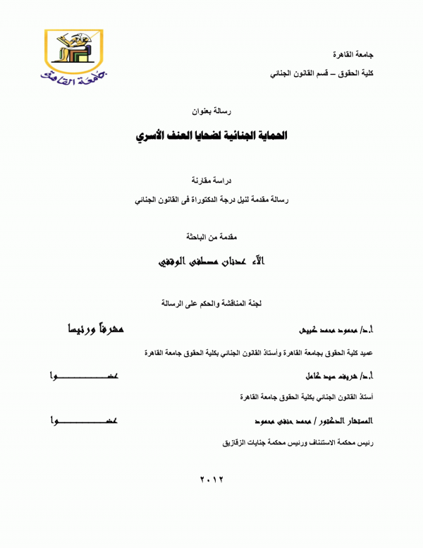 تناولت هذه الرسالة موضوع الحماية الجنائية لضحايا العنف الأسري و قد تناول ظاهرة العنف الأسري من خلال ماهية العنف الأسري و عوامل العنف الأسري و بين من هم ضحايا العنف الأسري: و لم يغفل البعد التاريخي لهذه الدراسة: و من ثم تناول كذلك موضوع العنف الأسري في الحضارات القديمة و إستعراض موقف الأديان السماوية ثم تناول المواجهة الجنائية الموضوعية لضحايا العنف الأري تحدث عن العنف الواقع على الحياة و سلامة الجسد ثم بين الحماية من العنف الولقع على السلامة النفسية