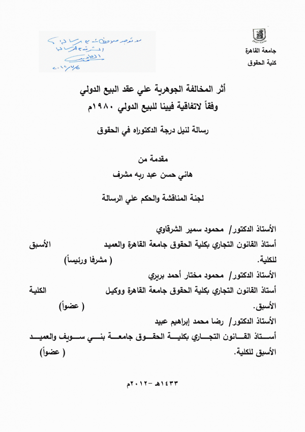 اطروحة (دكتوراه) - جامعة القاهرة - كلية الحقوق - قسم القانون التجارى، 2012