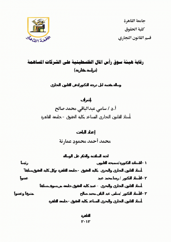 رقابة هيئة سوق رأس المال الفلسطينية على الشركات المساهمة : دراسة مقارنة / إعداد محمد أحمد محمود عمارنة ؛ إشراف سامي عبدالباقي محمد صالح