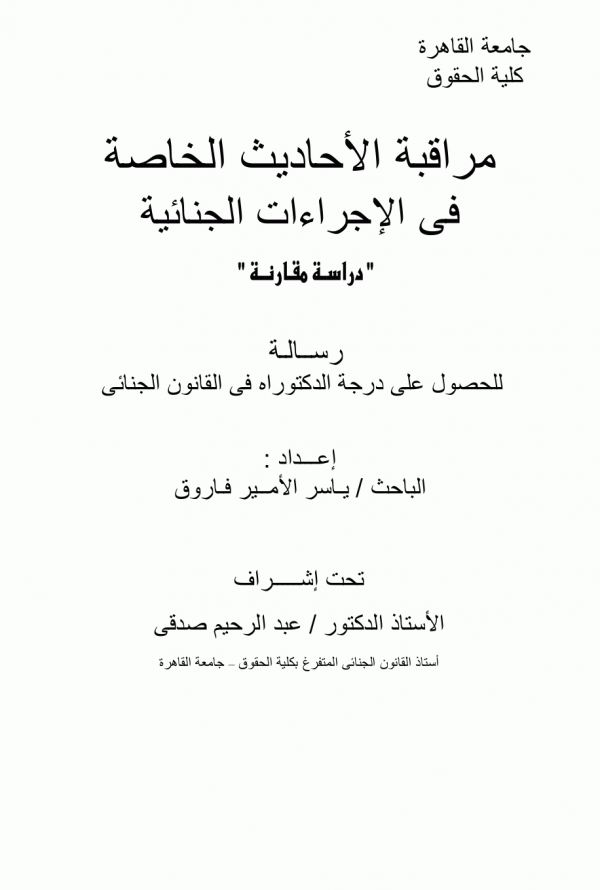 مراقبة الاحاديث الخاصة فى الاجراءات الجنائية : دراسة مقارنة / ياسر الأمير فاروق محمد