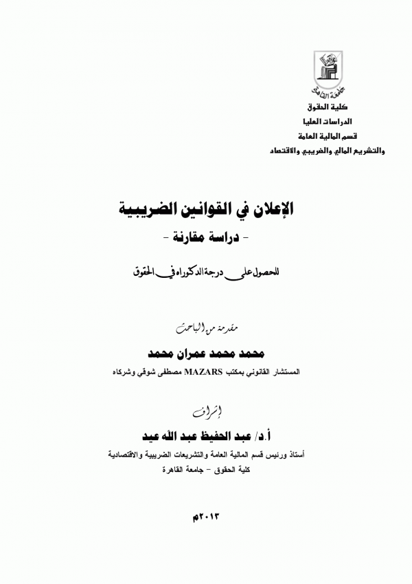 أطروحة (دكتوراه) - جامعة القاهرة، كلية الحقوق، قسم المالية العامة والتشريع الضريبي 2013.
