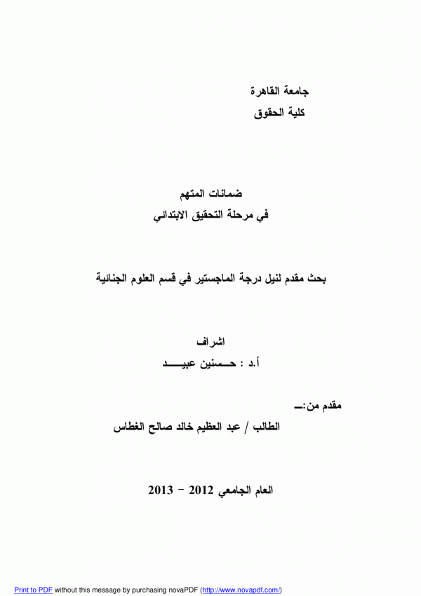 ضمانات المتهم في مرحلة التحقيق الإبتدائي / إعداد عبد العظيم خالد صالح الغطاس ؛ إشراف حسنين عبيد.