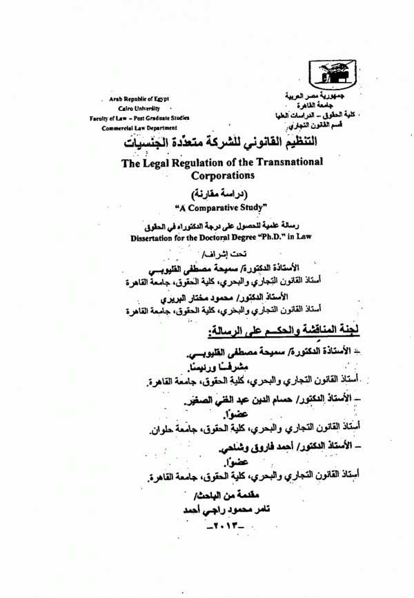 اطروحة (دكتوراه) - جامعة القاهرة - كلية الحقوق - قسم القانون التجاري، 2013