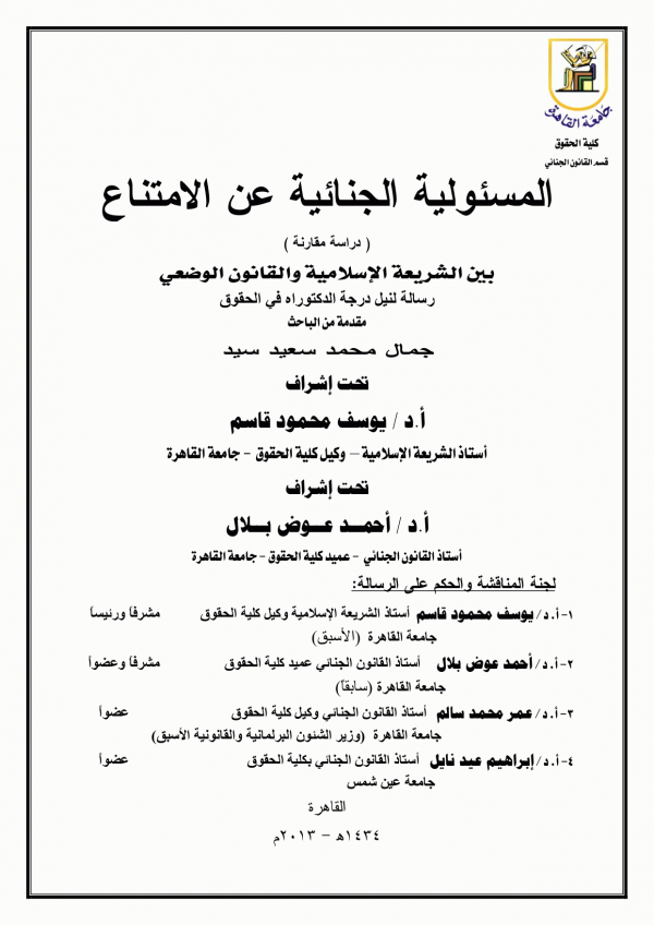 المسئولية الجنائية عن الامتناع : دراسة مقارنة بين الشريعة الإسلامية والقانون الوضعي / إعداد جمال محمد سعيد سيد ؛ إشراف يوسف محمود قاسم.
