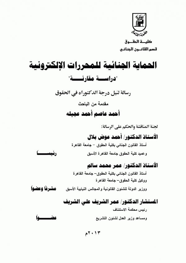 الحماية الجنائية للمحررات الإلكترونية : دراسة مقارنة / إعداد أحمد عاصم أحمد عجيله ؛ إشراف عمر محمد محمد سالم.