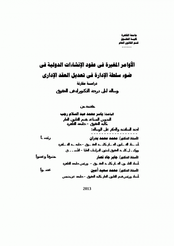 الأوامر المغيرة في عقود الإنشاءات الدولية في ضوء سلطة الإدارة في تعديل العقد الإداري : دراسة مقارنة / إعداد ياسر محمد عبد السلام رجب ؛ إشراف جابر جاد نصار.