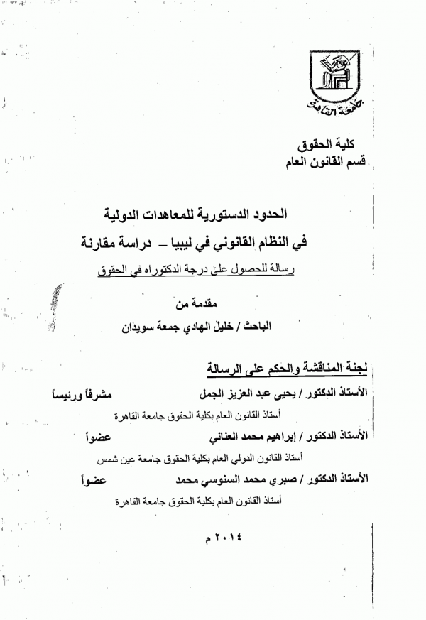 الحدود الدستورية للمعاهدات الدولية في النظام القانوني في ليبيا : دراسة مقارنة / خليل الهادي جمعة سويدان ؛ اشراف يحيى عبدالعزيز الجمل