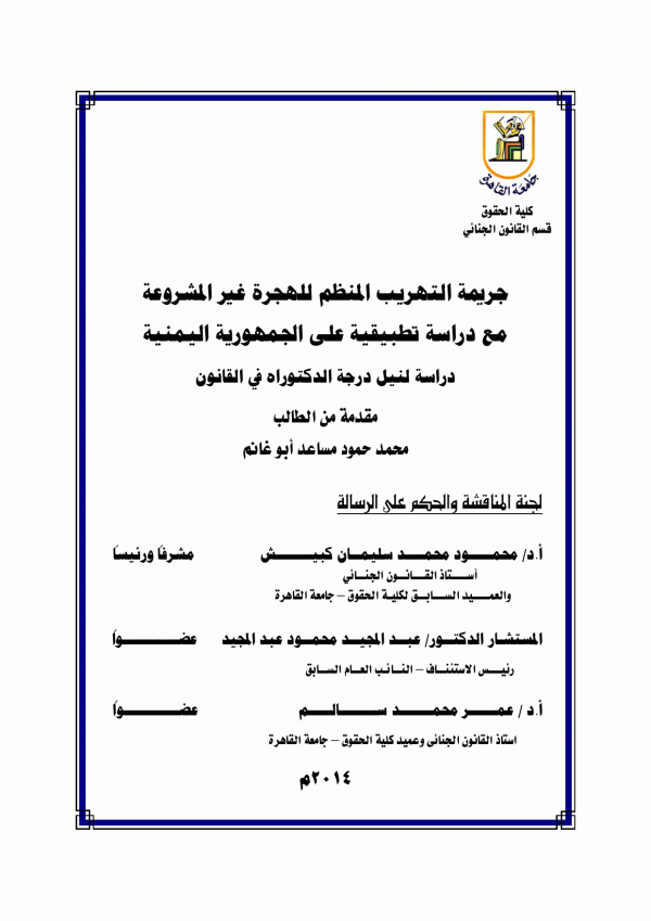 جريمة التهريب المنظم للهجرة غير المشروعة : مع دراسة تطبيقية على الجمهورية اليمنية / إعداد محمد حمود مساعد أبو غانم ؛ إشراف محمود محمد سليمان كبيش.