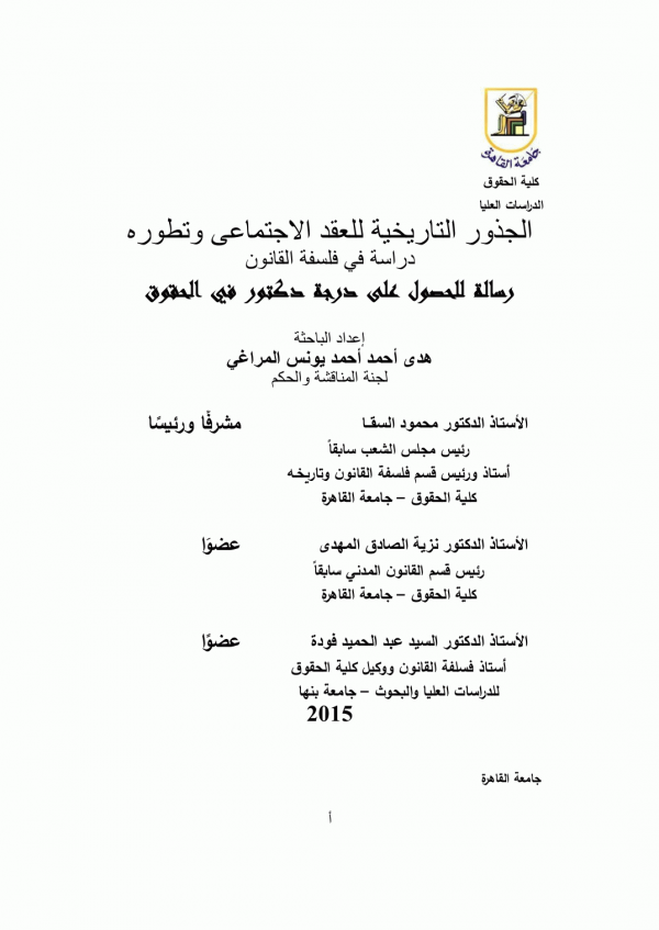 الجذور التاريخية للعقد الاجتماعي و تطوره : دراسة فى فلسفة القانون / هدى أحمد أحمد يونس المراغي