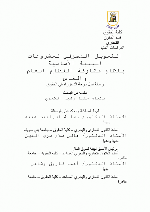 Online resources: Dissertation note: اطروحة (دكتوراه) - جامعة القاهرة - كلية الحقوق - قسم القانون العام، 2015 Summary: أن دراسة موضوع (التمويل المصرفي لمشروعات البنية الأساسية بنظام مشاركة القطاع العام والقطاع الخاص) له أهمية كبيرة حيث اعتبرت مشروعات البنية الأساسية الحد الفاصل بين الدول المتقدمة والنامية: وبتداخلها مع قطاعات أخرى من أجل إنشائها لأنها تتطلب دعماً كبيراً: فهي منظومة متكاملة من حيث التمويل والمشاركة في إنشائها من أشخاص القطاع العام والخاص: حيث تنطوي تحتها عدة عقود واتفاقيات وأشخاص: بمعنى أن لديها علاقات متشعبة ومختلفة ومتعددة تتداخل في ما بينها من أجل انشائها، وتناولت الدراسة مفهوم الجهاز المصرفي وماهية مشروعات البنية الأساسية ومراحل تطورها، وبحثت الدراسة ايضا في الدور التمويلي للجهاز المصرفي لمشروعات البنية الأساسية، بالاضافه الى الآثار المترتبة على مشروعات البنية الاساسية وكيفية توزيعها: وتطرقنا إلى عرض بعض التجارب المحلية والدولية: وأخيراً تضمنت نهاية دراستنا على كيفية انتهاء مشروعات البنية الاساسية وتسوية المنازعات فيها