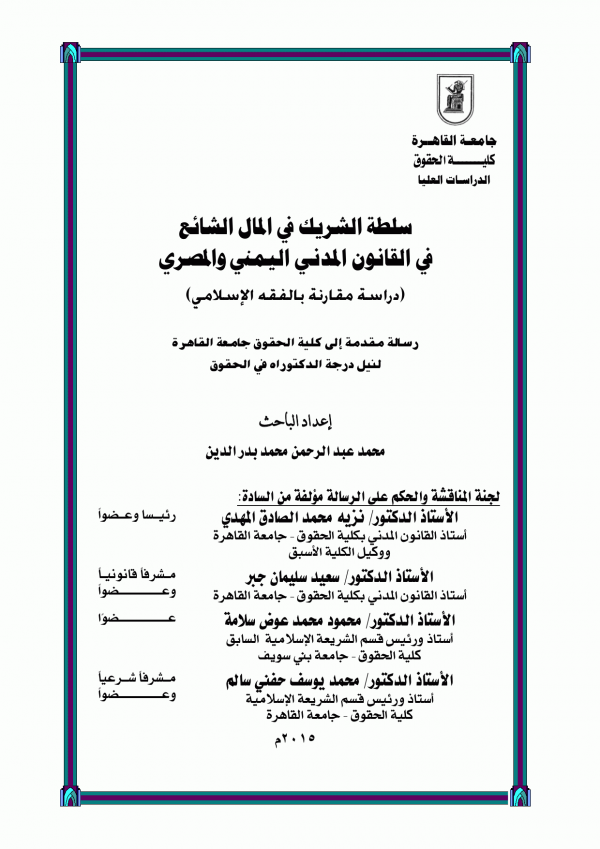 سلطة الشريك في المال الشائع في القانون المدني اليمني والمصري : دراسة مقارنة بالفقه الإسلامي / إعداد محمد عبدالرحمن محمد بدر الدين ؛ إشراف سعيد سليمان جبر : محمد يوسف حفني سالم