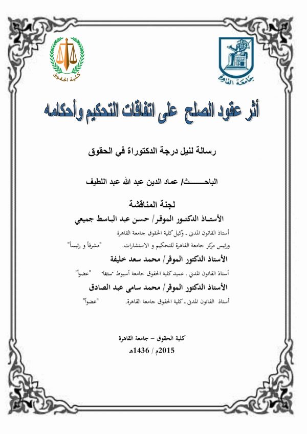 أثر عقود الصلح على اتفاقات التحكيم وأحكامه / إعداد عماد الدين عبدالله عبد اللطيف ؛ إشراف الأستاذ الدكتور حسن عبد الباسط جميعى.