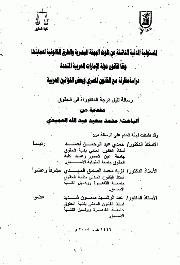 المسئولية المدنية الناشئة عن تلوث البيئة البحرية والطرق القانونية لحمايتها وفقا لقانون دولة الامارات العربية المتحدة : دراسة مقارنة مع القانون المصرى وبعض القوانين العربية / محمد سعيد عبد الله الحميدي