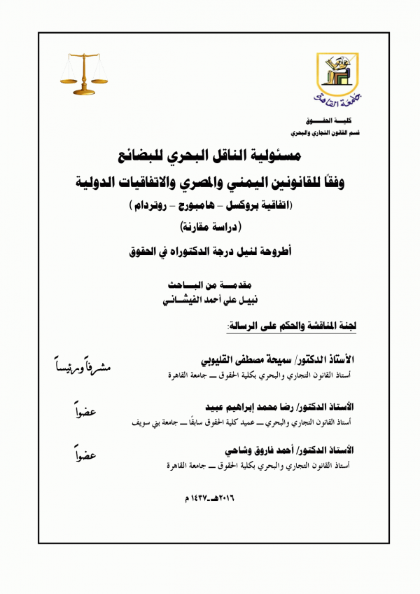 مسئولية الناقل البحري للبضائع وفقاً للقانونين اليمني والمصري والاتفاقيات الدولية -اتفاقية بروكسل {u٢٠١٣} هامبورج {u٢٠١٣} روتردام : دراسة مقارنة / نبيـل علي أحمد الفيشاني