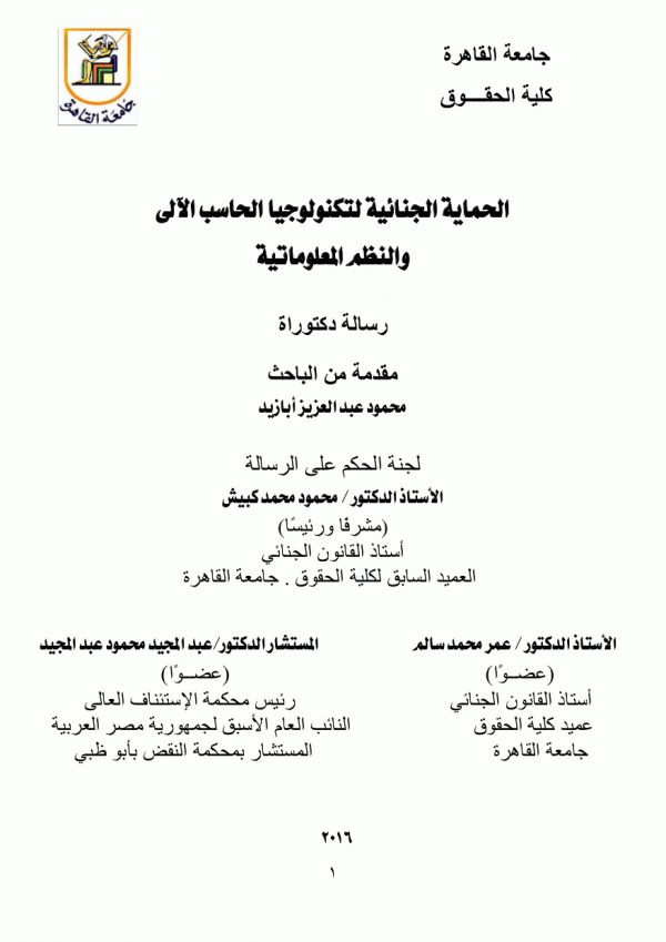 اطروحة (دكتوراه) - جامعة القاهرة - كلية الحقوق - قسم القانون الجنائى، 2016