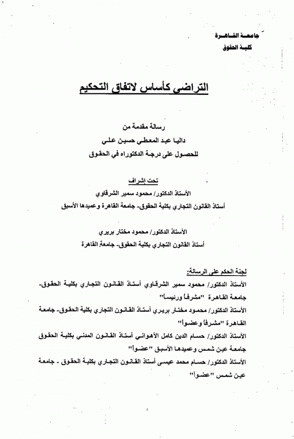 التراضى كأساس لاتفاق التحكيم / داليا عبد المعطى حسين علي ؛ إشراف محمود سمير الشرقاوي : محمود مختار بربري