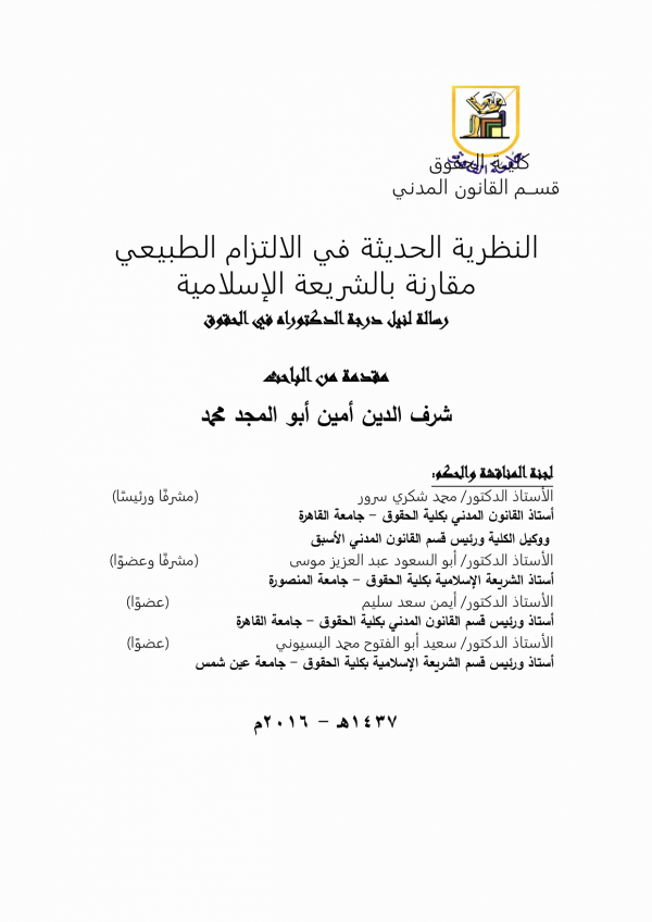 النظرية الحديثة فى الالتزام الطبيعى مقارنة بالشريعة الإسلامية / شرف الدين أمين أبوالمجد محمد