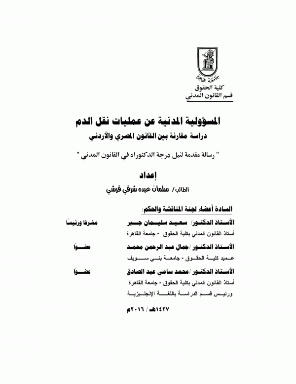 المسؤولية المدنية عن عمليات نقل الدم : دراسة مقارنة بين القانون المصرى و الأردنى / إعداد سلمان عبده شرقى قرشى ؛ إشراف سعيد سليمان جبر