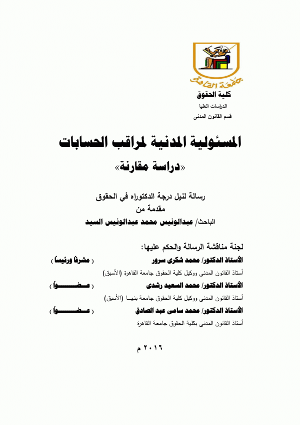 المسئولية المدنية لمراقب الحسابات : دراسة مقارنة / إعداد عبدالونيس محمد عبدالونيس السيد ؛ إشراف الأستاذ الدكتور محمد شكري سرور.