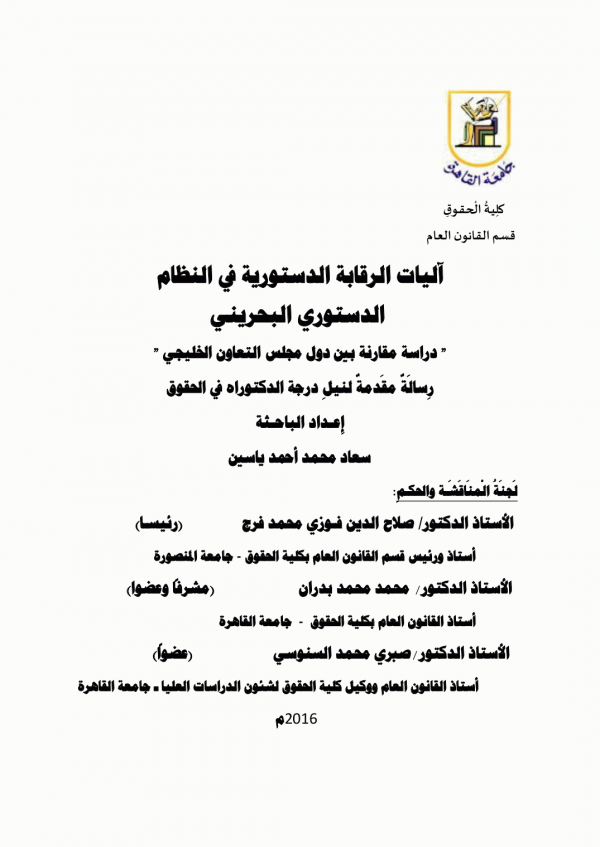 آليات الرقابة الدستورية في النظام الدستوري البحريني : دراسة مقارنة بين دول مجلس التعاون الخليجي / سعاد محمد أحمد ياسين