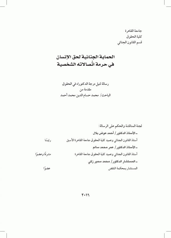 الحماية الجنائية لحق الإنسان في حرمة اتِّصالاته الشخصية : دراسة مقارنة بين القانونين المصري و الأمريكي / محمد حسام الدين محمد أحمد ؛ اشراف عمر محمد سالم