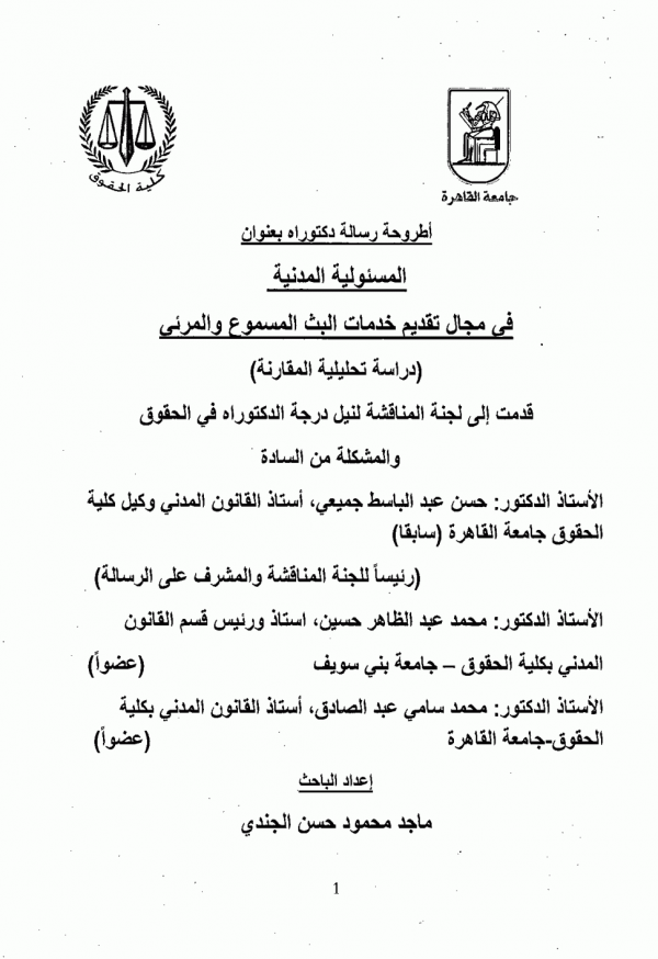 المسئولية المدنية في مجال تقديم خدمات البث المسموع والمرئي : دراسة تحليلية المقارنة / إعداد ماجد محمود حسن الجندى ؛ إشراف الأستاذ الدكتور حسن عبدالباسط جميعى.