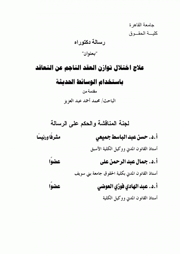 علاج اختلال توازن العقد الناجم عن التعاقد باستخدام الوسائط الحديثة / إعداد محمد أحمد عبدالعزيز ؛ إشراف أ.د حسن عبدالباسط جميعي.