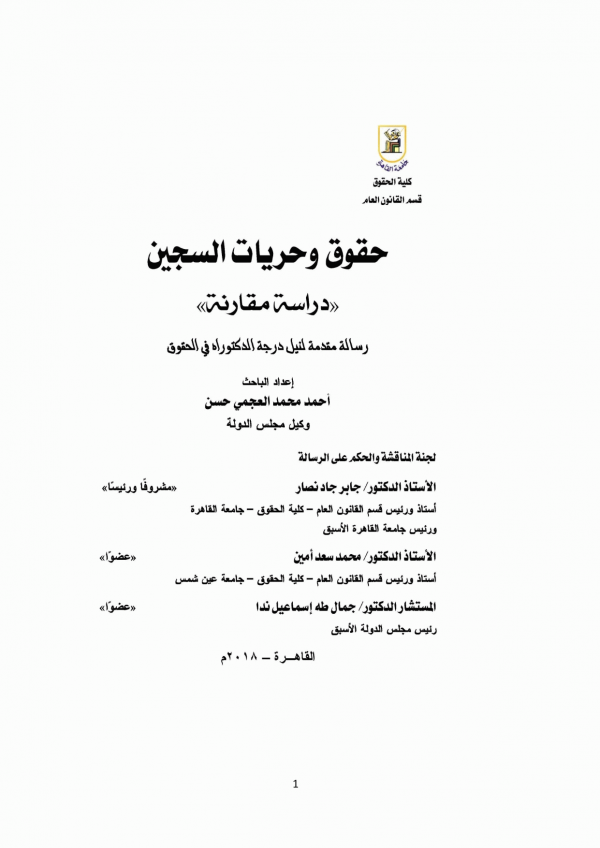 حقوق وحريات السجين : دراسة مقارنة / إعداد أحمد محمد العجمى حسن :؛ إشراف جابر جاد نصار