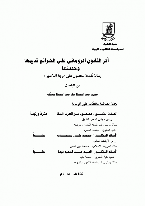 The letter clarifies the effect of Romanian law on the law Egyptian Greek. And the old French customs But the French Civil Code issued in 1804 Through the committee charged with forming Napoleon. In addition to modern Egyptian law. Did the Roman law have an impact on heavenly laws or not..? of course not.