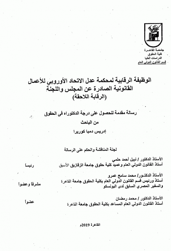 الوظيفة الرقابية لمحكمة عدل الاتحاد الأوروبى للأعمال القانونية الصادرة عن المجلس و اللجنة : الرقابة اللاحقة / إدريس دميا كوريرا
