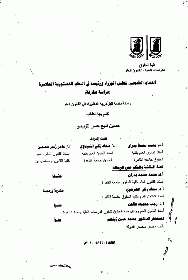 النظام القانوني لمجلس الوزراء ورئيسه في النظم الدستورية المعاصرة : دراسة مقارنة / إعداد حسين فليح حسن الزبيدي ؛ إشراف محمد محمد بدران : سعاد زكي الشرقاوي : عامر زغير محيسن
