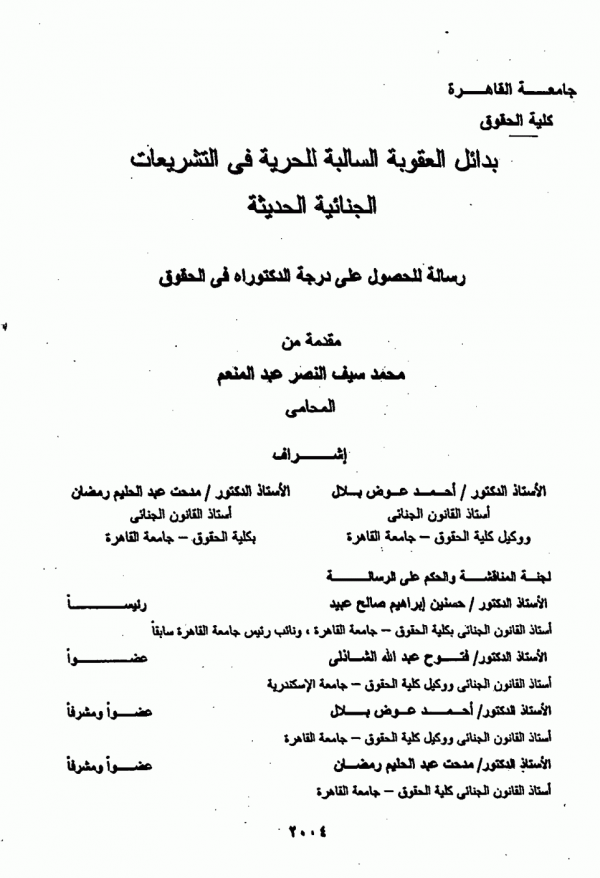 Law1 10 PHD 2003 1003866 C2 اثر الروابط الاسرية على تطبيق القانون الجنائي في الانظمة القانونية المقارنة / | Law1 10 PHD 2004 1000919 C1 سلطات مامور الضبط القضائى فى القبض والتفتيش : دراسة مقارنة / | Law1 10 PHD 2004 1001196 C1 بدائل العقوبة السالبة للحرية في التشريعات الجنائية الحديثة / | Law1 10 PHD 2004 1001197 C2 بدائل العقوبة السالبة للحرية في التشريعات الجنائية الحديثة / | Law1 10 PHD 2004 1002233 C1 الحماية الجنائية للحق فى الشرف والاعتبار : دراسة مقارنة / | Law1 10 PHD 2004 1002234 C2 الحماية الجنائية للحق فى الشرف والاعتبار : دراسة مقارنة / | Law1 10 PHD 2004 1002260 C1 الصلح فى قانون الاجراءات الجنائية ماهيته والنظم المرتبطة به : دراسة مقارنة / |