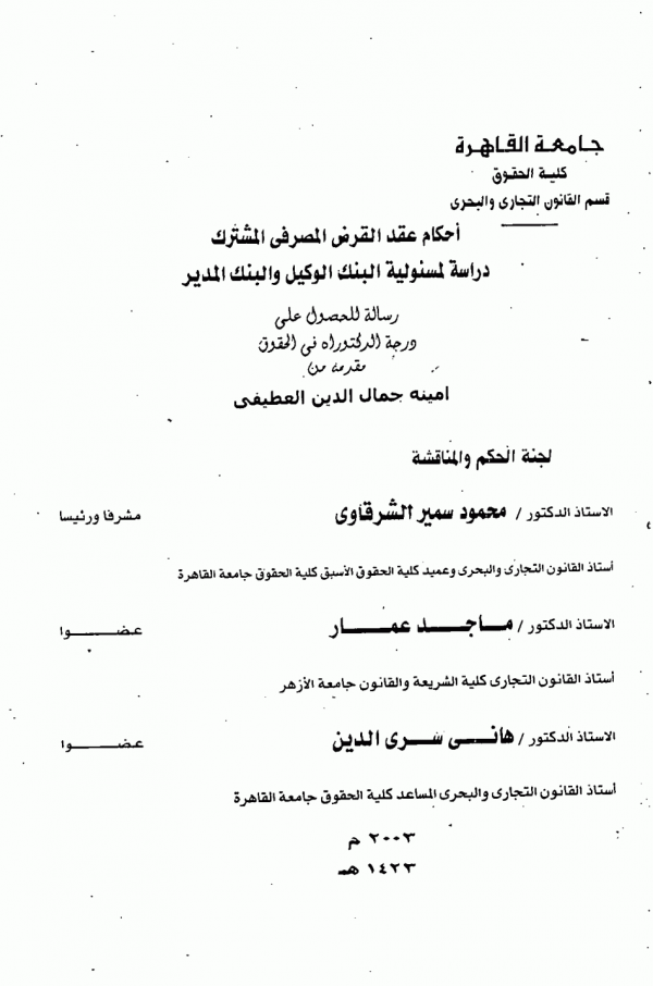أحكام عقد القرض المصرفي المشترك : دراسة لمسئولية البنك الوكيل والبنك المدير / إعداد أمينة جمال الدين العطيفي ؛ إشراف محمود سمير الشرقاوي