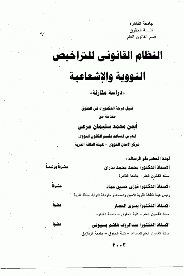 النظام القانونى للتراخيص النووية والاشعاعية : دراسة مقارنة / ايمن محمد سليمان مرعى