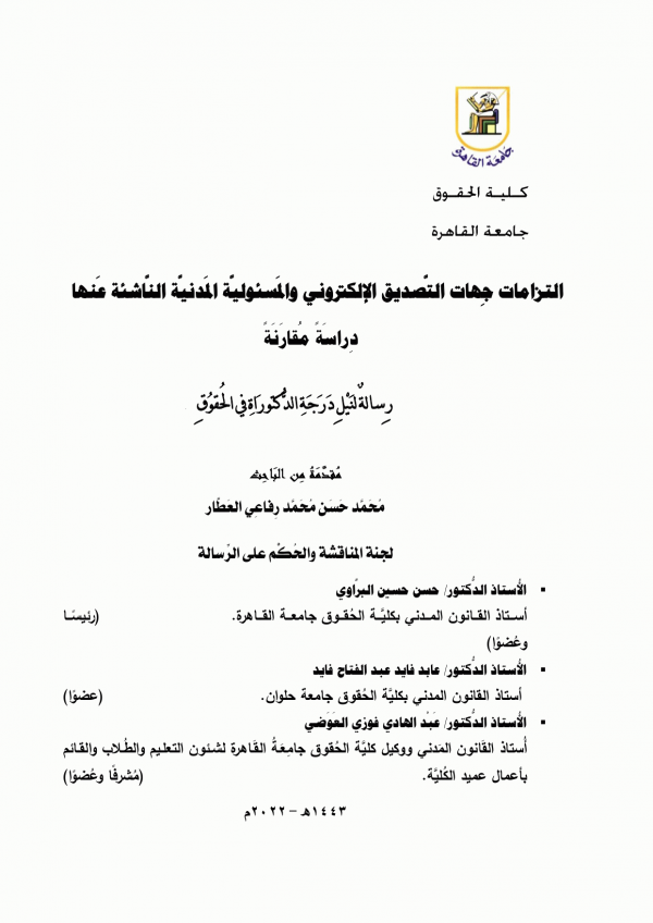 التزامات جهات التصديق الإلكتروني والمسئولية المدنية الناشئة عنها : دراسة مقارنة / إعداد محمد حسن محمد رفاعي العطار ؛ إشراف الأستاذ الدكتور عبد الهادي فوزي العوضي.