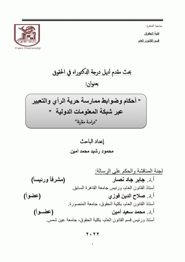 أحكام وضوابط ممارسة حرية الرأي والتعبير عبر شبكة المعلومات الدولية : "دراسة مقارنة" / إعداد محمود رشيد محمد أمين ؛ إشراف جابر جاد نصار.