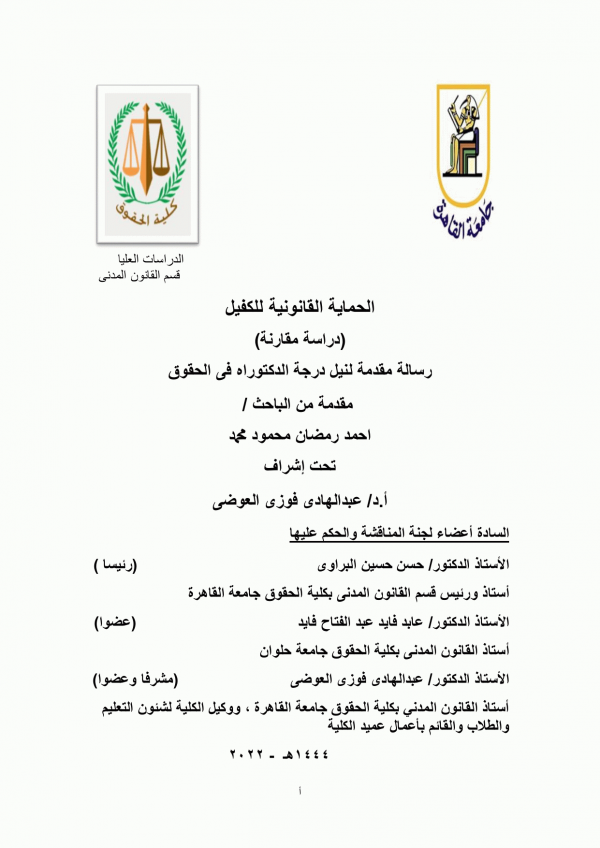 الحماية القانونية للكفيل : دراسة مقارنة / إعداد احمد رمضان محمود محمد .