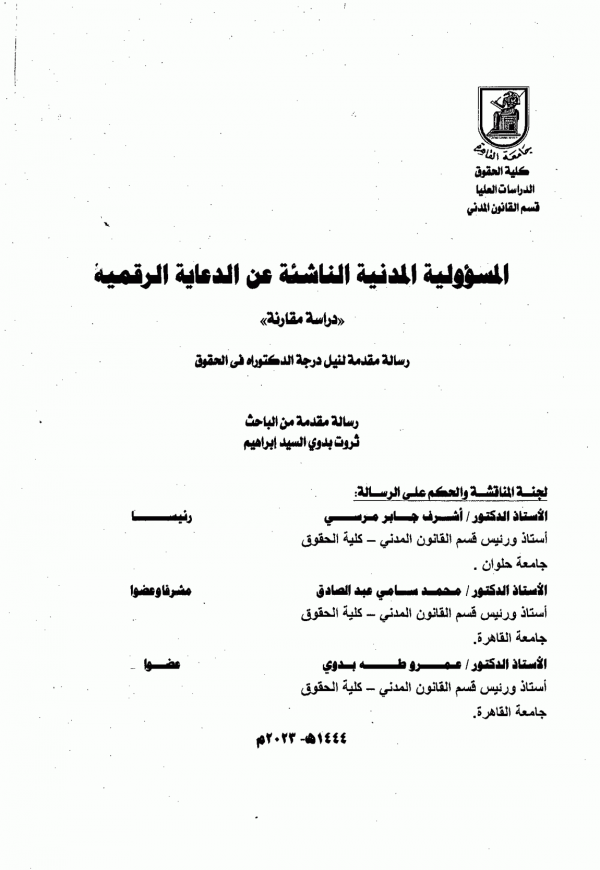 المسئولية المدنية الناشئة عن الدعاية الرقمية : دراسة مقارنة / إعداد ثروت البدري السيد إبراهيم ؛ إشراف محمد سامي عبد الصادق، عمرو طه بدوي.