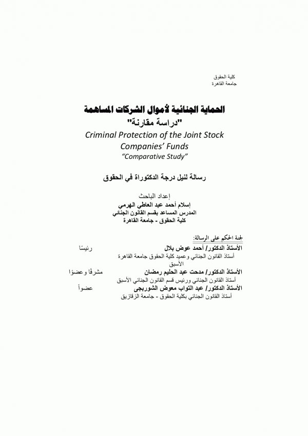 الحماية الجنائية لأموال الشركات المساهمة : دراسة مقارنة" / إسلام أحمد عبد العاطي الهرمي