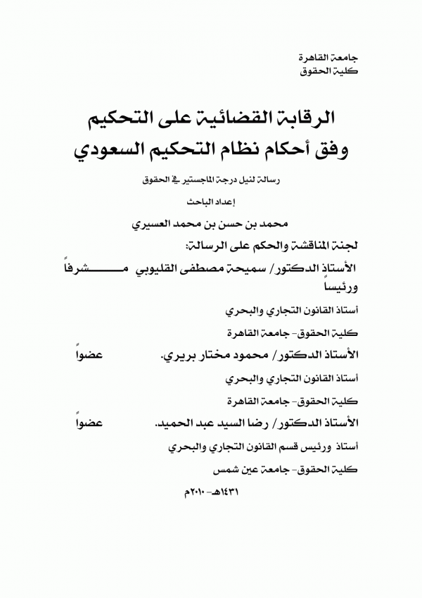 الرقابة القضائية على التحكيم وفق أحكام نظام التحكيم السعودي / إعداد محمد بن حسن بن محمد العسيري ؛ إشراف الأستاذ الدكتور سميحة مصطفى القليوبي.